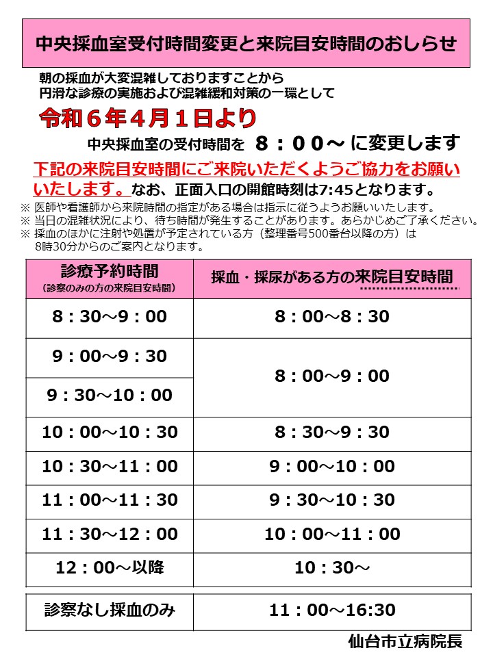 以下のとおり、中央採血室受付時間の変更および受診時の来院目安時間の設定についておしらせです。