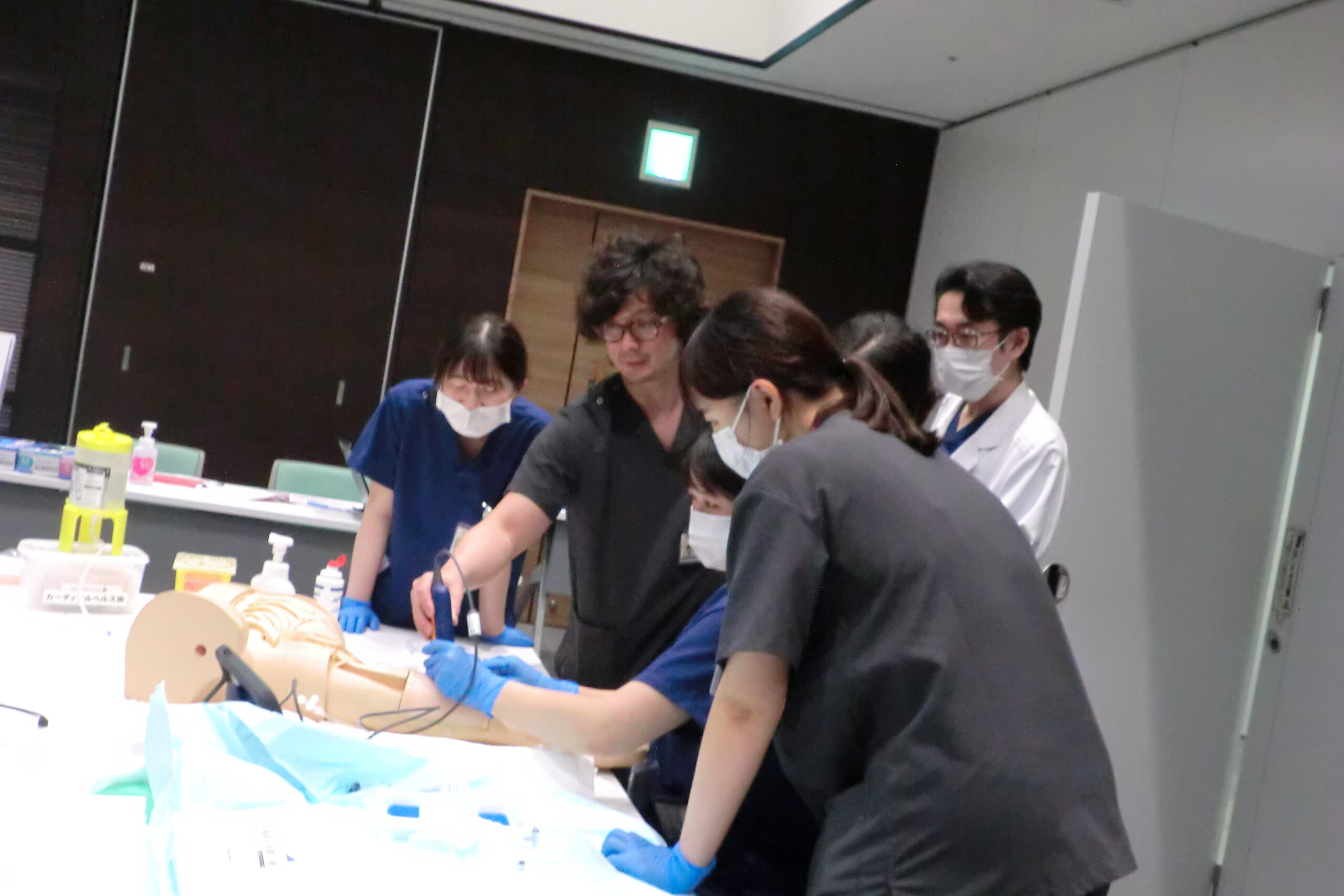 当院では、毎週木曜日の17時30分以降を研修医勉強会の時間と位置付け、当直業務に役立つ実践的な研修や、救命救急センター症例検討会、若手スタッフドクターによる自主的勉強会等、様々な勉強会を実施し、当直担当者以外の研修医が積極的に研修に参加できるよう配慮しています。